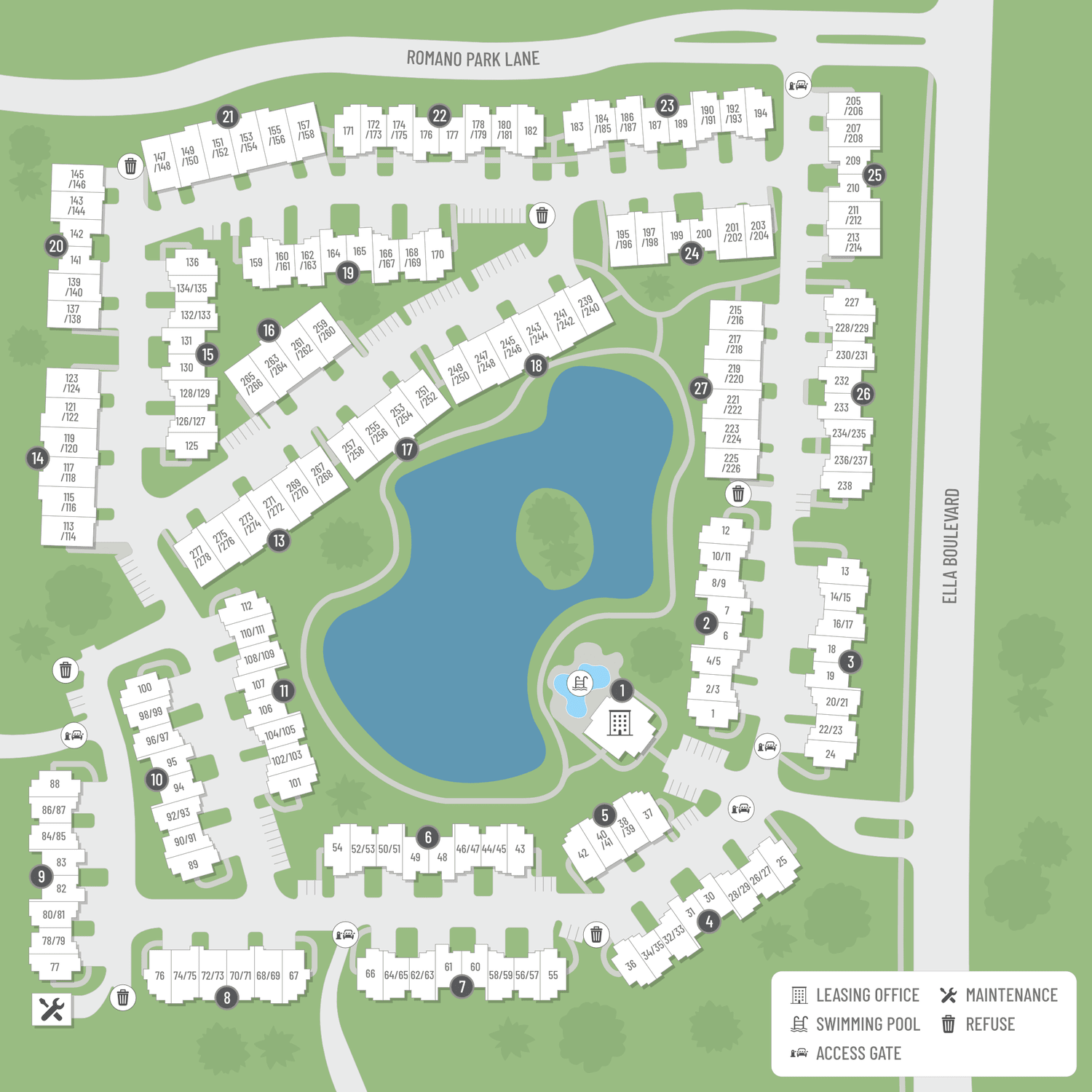 Select a floor plan or bedroom count to view those units on the overhead view on the site map. If you need assistance finding a unit in a specific location please call us at 281-583-5511 TTY: 711.